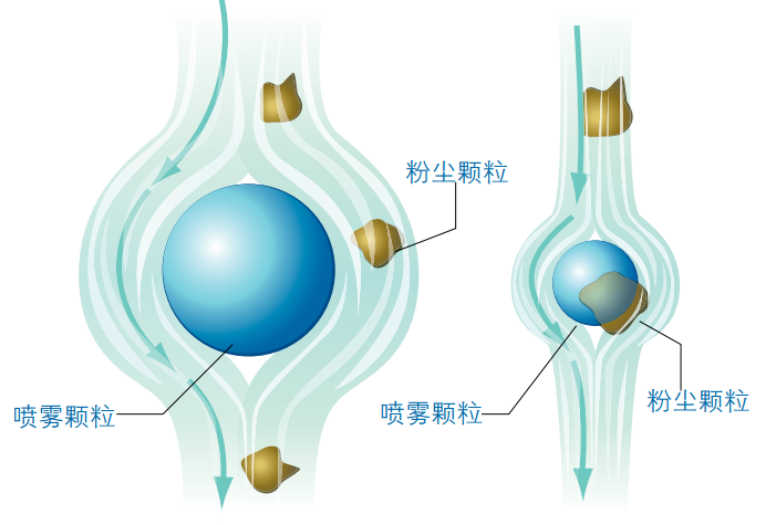 濕法粉塵控制中當(dāng)粉塵顆粒碰撞到粒徑比例合適的液滴時(shí),粉塵捕獲效率會提高。液滴太大,就不能碰撞到小的粉塵顆粒;液滴太小,則會因蒸發(fā)過快而釋放出已經(jīng)捕獲的粉塵顆粒。因此,了解粉塵的粒徑對于噴霧除塵系統(tǒng)的設(shè)計(jì)來說是至關(guān)重要的。您可以使用通用指南來了解相關(guān)粉塵粒徑。但是,更進(jìn)一步的研究是很必要的,這些研究要基于材料本身和該材料處于加工過程中的不同階段。