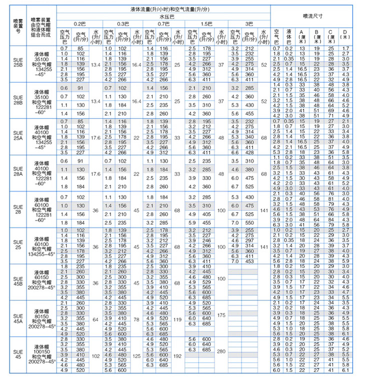 通過外部混合裝置改變氣體壓力而不改變液體流率來控制霧化,對于扇形噴霧,尺寸”A“流型寬度,如圖所示。噴嘴從噴嘴投射到彌散點的總距離為“D”。壓縮空氣和液體在噴嘴外混合,一般而言,是屬于不阻塞的型式。外部混合型也分為內(nèi)氣型與外氣型。