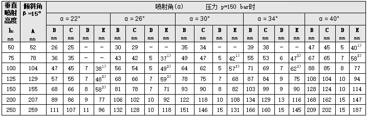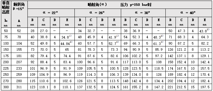 所列值基于p=150bar的噴射壓力。表格所列的數(shù)值考慮了噴射的收斂性。其他噴射壓力的噴射寬度數(shù)據(jù)可根據(jù)要求提供。