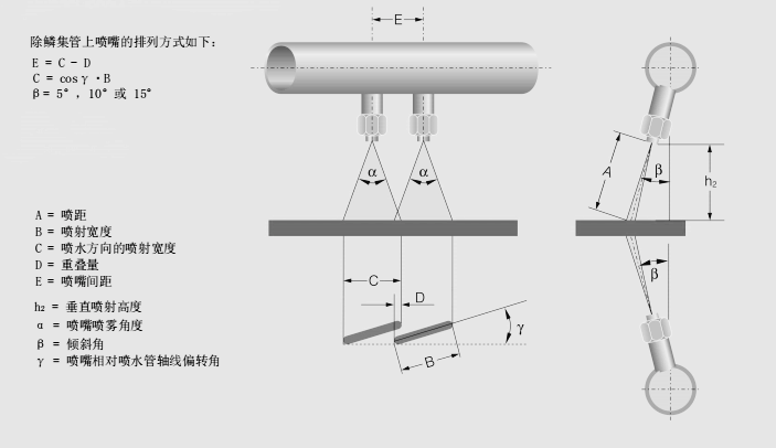 噴距 ( A )、噴射寬度( B、C )、重疊量 ( D )、噴嘴距離 ( E ),垂直噴淋高度( h2 )、噴嘴噴射角 ( α )、傾斜角 ( β )