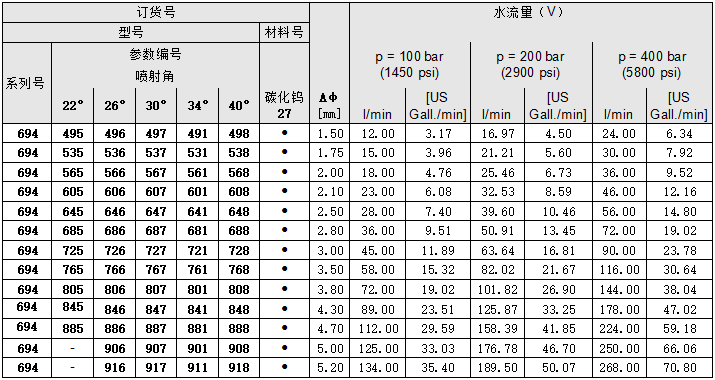 • 經濟型694系列噴嘴的設計針對惡劣的鋼廠環(huán)境,碳化鎢材質的噴嘴芯可以承受最高的壓力、惡劣的水質及顆粒的磨損。