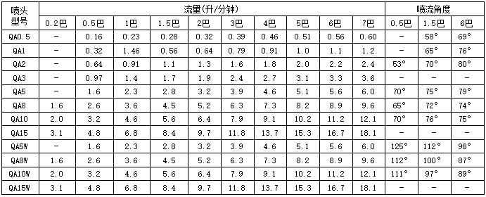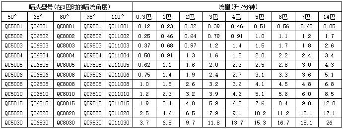 噴嘴體可有1/8",1/4"和3/8"三種規(guī)格,內層O型丁晴橡膠密封圈確保噴嘴體和噴頭之間的絕對密封??觳饑娮斓膰婎^具有特殊的外形,以便抓握。噴頭具有QC扇形、QB實心錐形和QA空心錐形三種類型,分別提供扇形、實心錐形和空心錐形三種噴霧模式,并有多種流量和角度可供選擇。